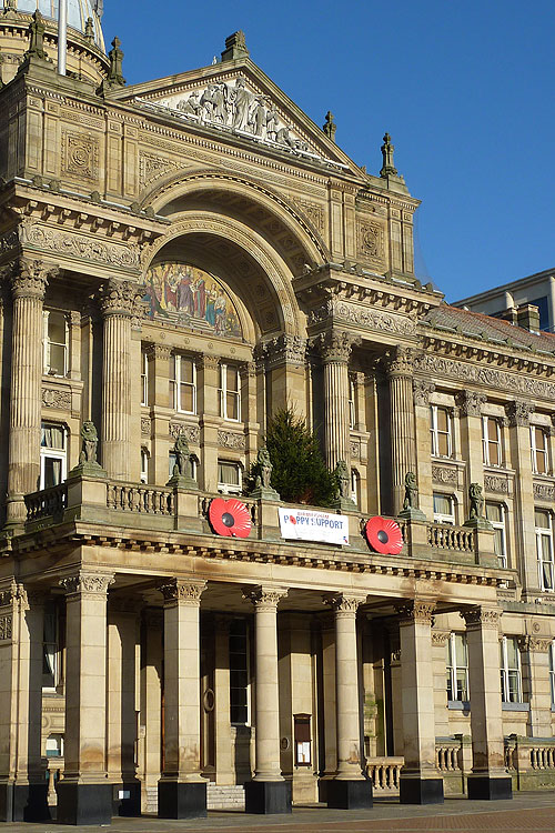 Over alt så man de røde valmuer i anledning af Remembrance Day. Her er det byens rådhus, der viser sin støtte til dagen, der også er kendt som 'Poppy Day'.