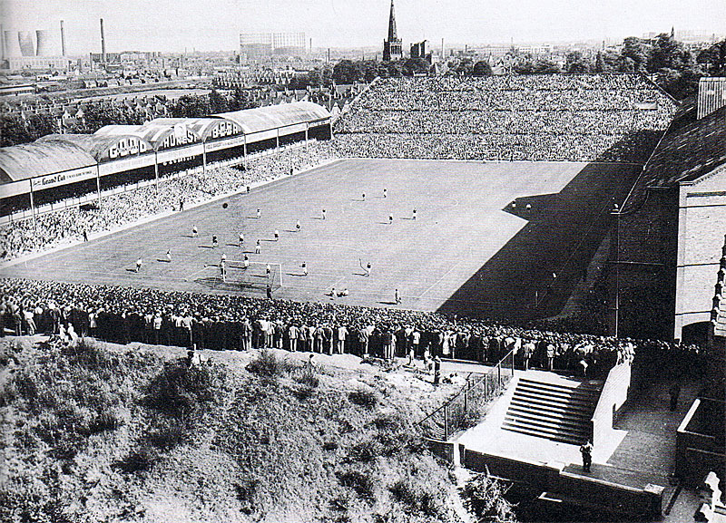 Billedet her er formentlig fra engang i 1950'erne - i hvert fald fra før der kom projektører i 1958. Dengang kunne Villa Park rumme næsten dobbelt så mange tilskuere som i dag. Rekorden var og er 76.588 og blev sat i marts 1946. Holte End er længst væk på billedet og Trinity Road Stand i højre side.