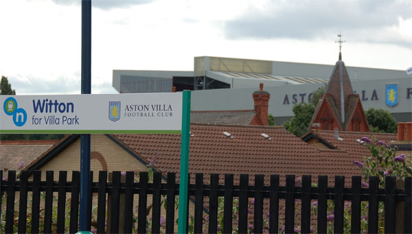 Doug Ellis Stand - eller Witton Lane Stand som mange stadig kalder den. Bag ruderne længst mod højre har politiet kommandocentral under kampene, ligesom Sky Sports har deres studie der.